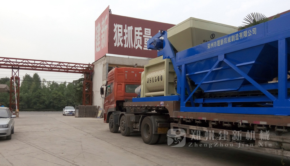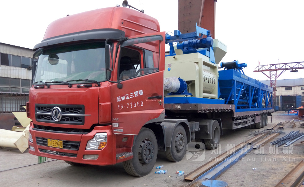 2015年7月13日,鄭州建新再發(fā)一套HZS75混凝土攪拌站設(shè)備,發(fā)往甘肅省。圖為JS1500混凝土攪拌機(jī)以及PLD2400混凝土配料機(jī)裝車過(guò)程。