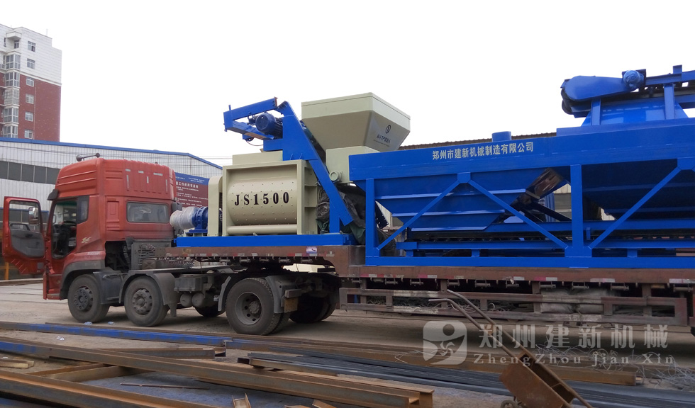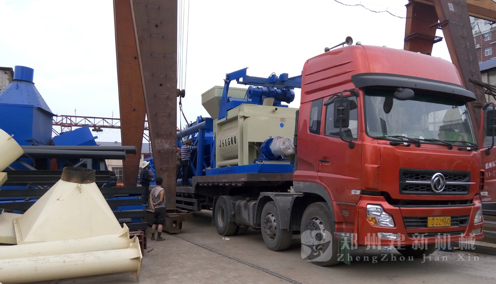 2015年7月13日,鄭州建新再發(fā)一套HZS75混凝土攪拌站設(shè)備,發(fā)往甘肅省。圖為JS1500混凝土攪拌機(jī)以及PLD2400混凝土配料機(jī)裝車過(guò)程。